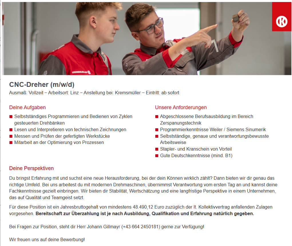 Das kollektivvertragliche Bruttomonatsgehalt für diese Position liegt bei mind. € 3.396,21 bei einer Vollzeitbeschäftigung, mit Bereitschaft zur Überzahlung je nach Qualifikation und Berufserfahrung